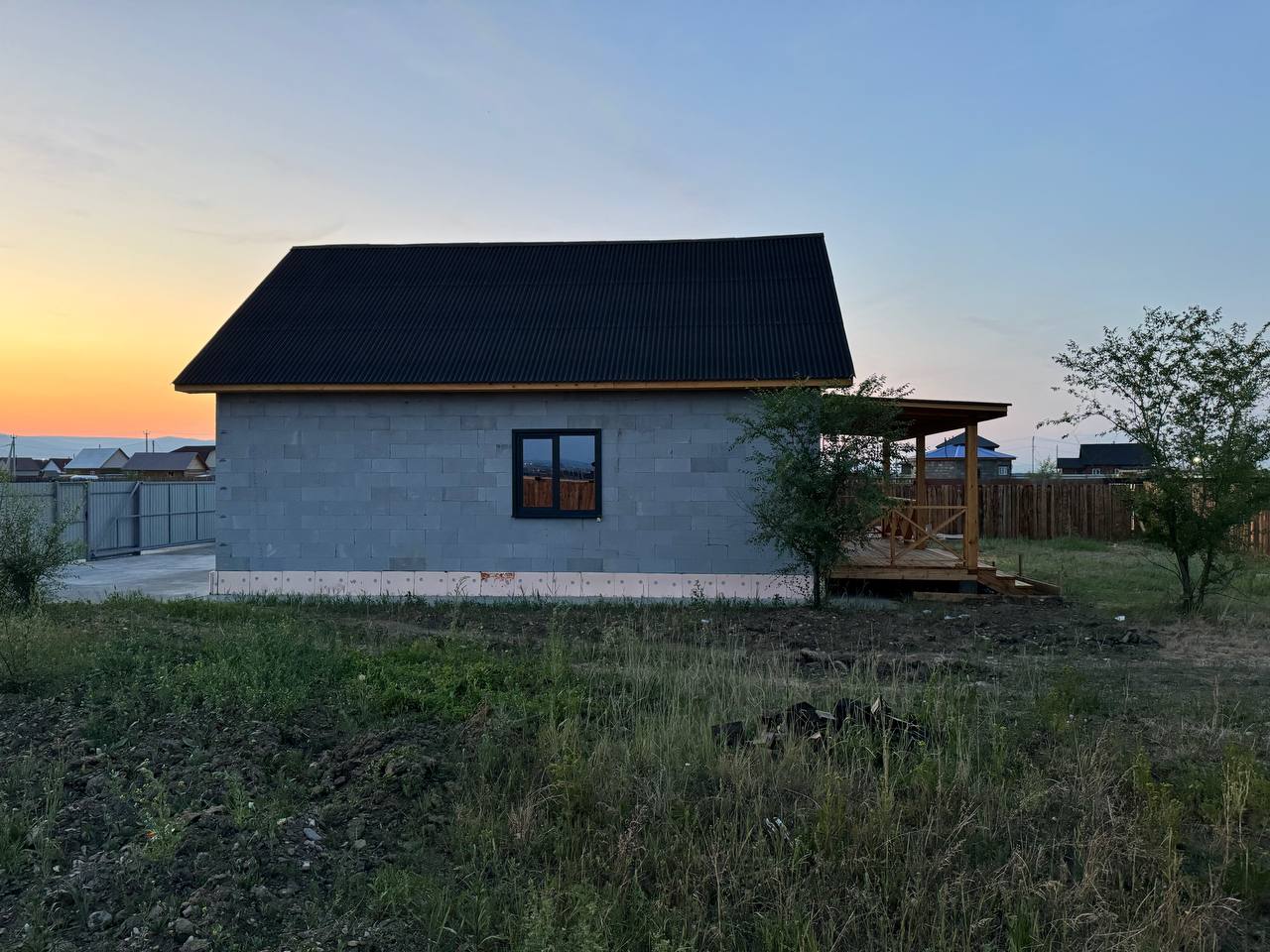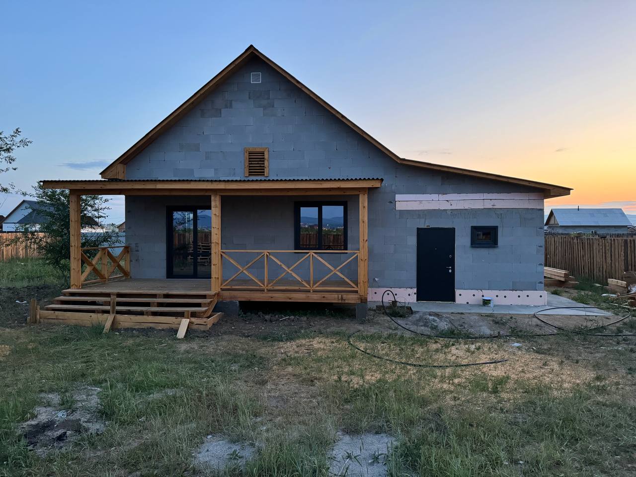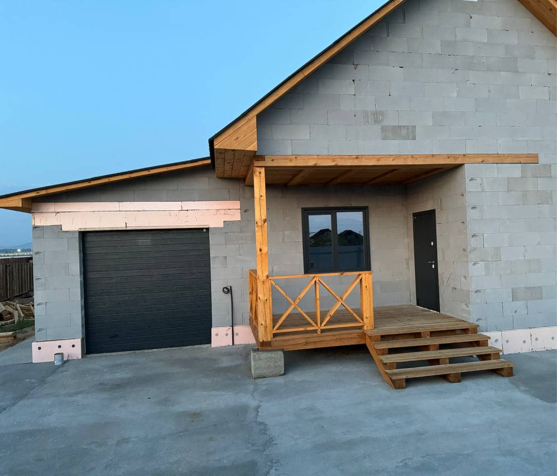 Дом из газобетона, гараж, крытая терраса. Общая площадь 96,7 м². 2 спальни и просторная кухня-гостиная.
