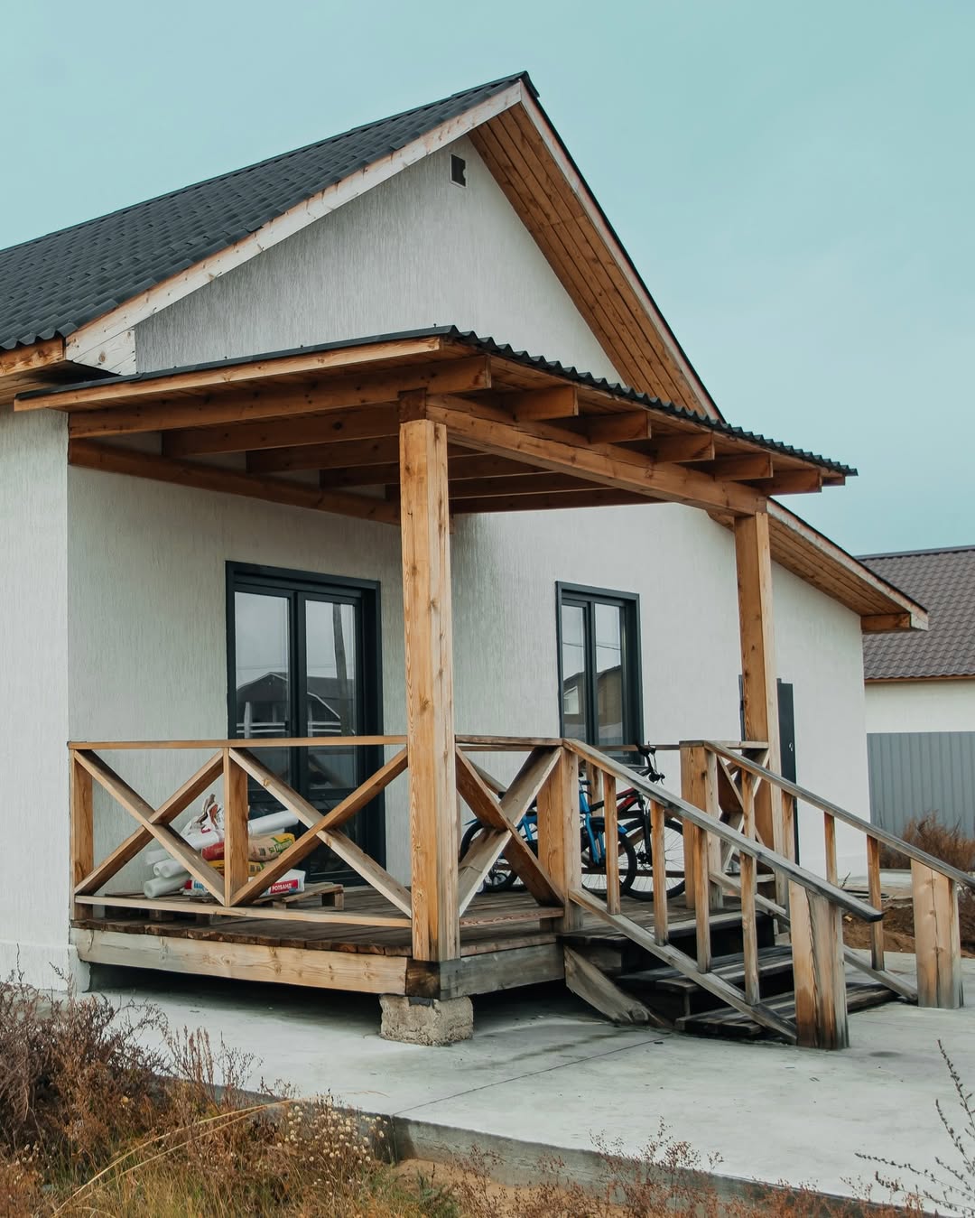 Дом из натурального бруса площадью 86 кв. м с кухней-гостиной и спальней, гаражом и уютной террасой.